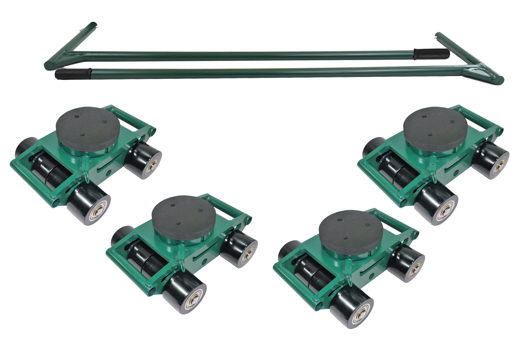The 36, 48, and 72 metric ton sets come with either swivel padded or swivel diamond tops. The sets feature (2) steering handles. For alignment, a 1-inch round bar can be used to connect (2) skates (not included in set).